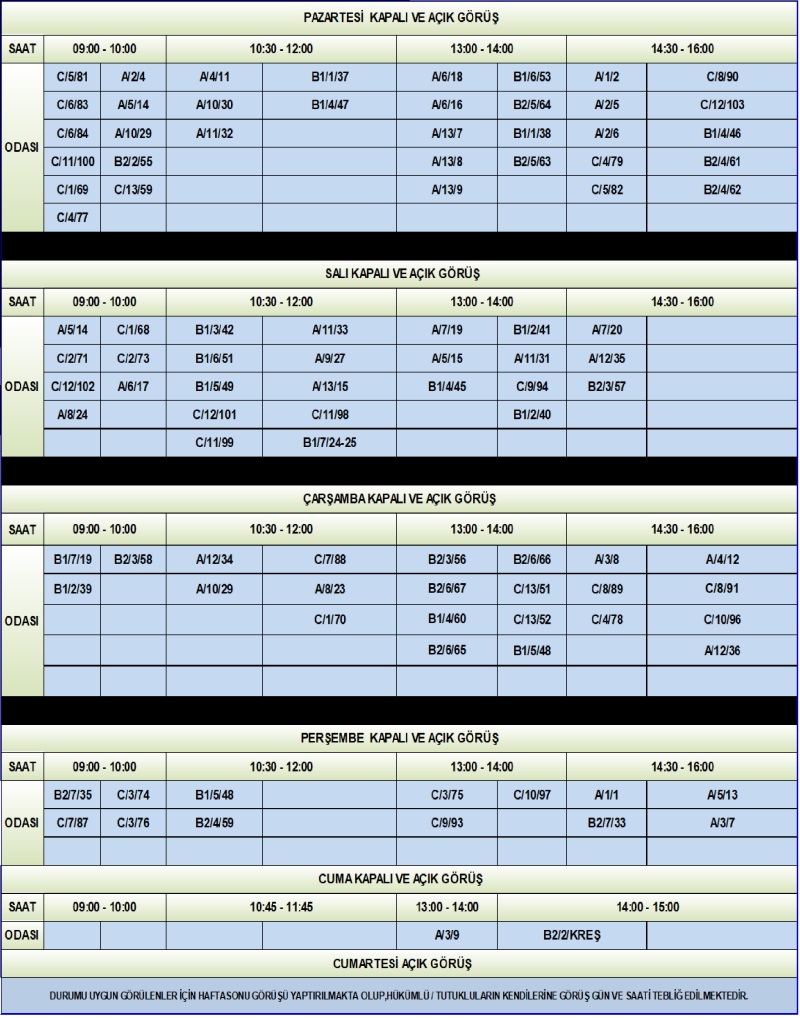 ,*Pandemi döneminde yapılamayan görüşler için 7 Ekim 2024 tarihinden itibaren görüş hakkını telefon seçenler 1 saat görüş ,ziyaret seçenler 1,5 saat görüş yapacaktır.