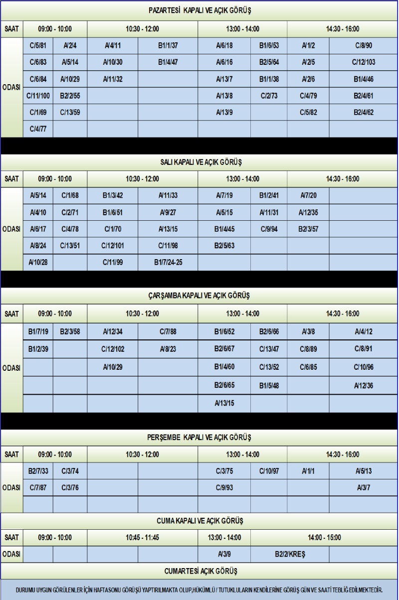 Ziyaret gün ve saat tablosunda hükümlü ve tutuklunun koğuş numarasını bulamayan ziyaretçiler kurumu arayarak bilgi alabilirler.